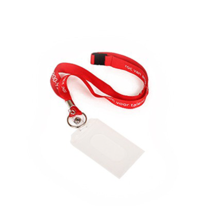 Het product bevat een plastic badgehouder, crimp clip, sleutelhanger en veiligheidsclip in de nek. De rode lanyard is voorzien van 1 kleurige tekst: ‘ROC van Amsterdam, podium voor talent’.