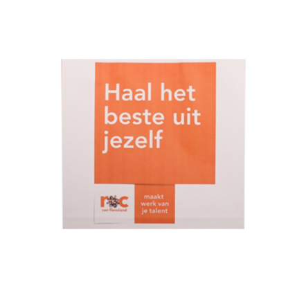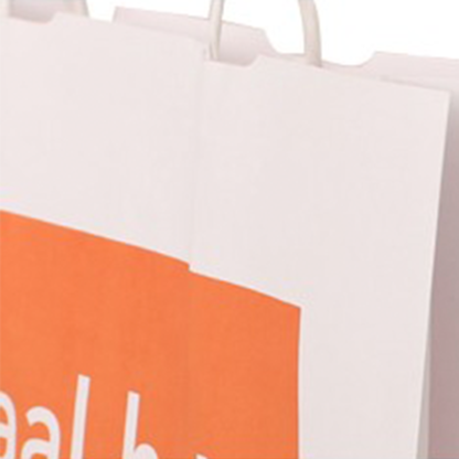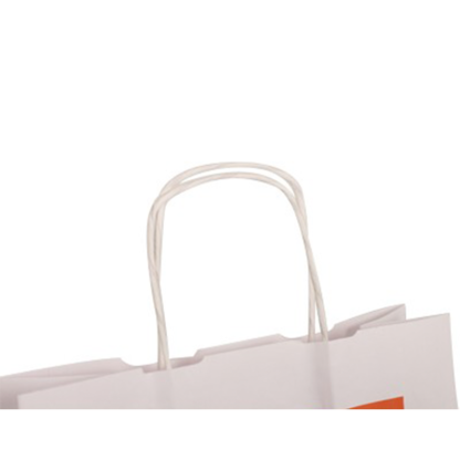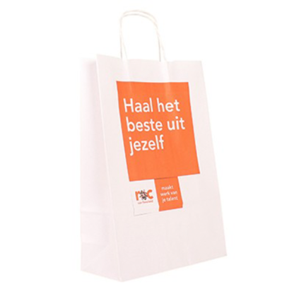 Witte papieren tas van 100 grams gerecycled kraft materiaal met gedraaide papieren hengsels. Bedrukt aan de voor- en achterzijde.